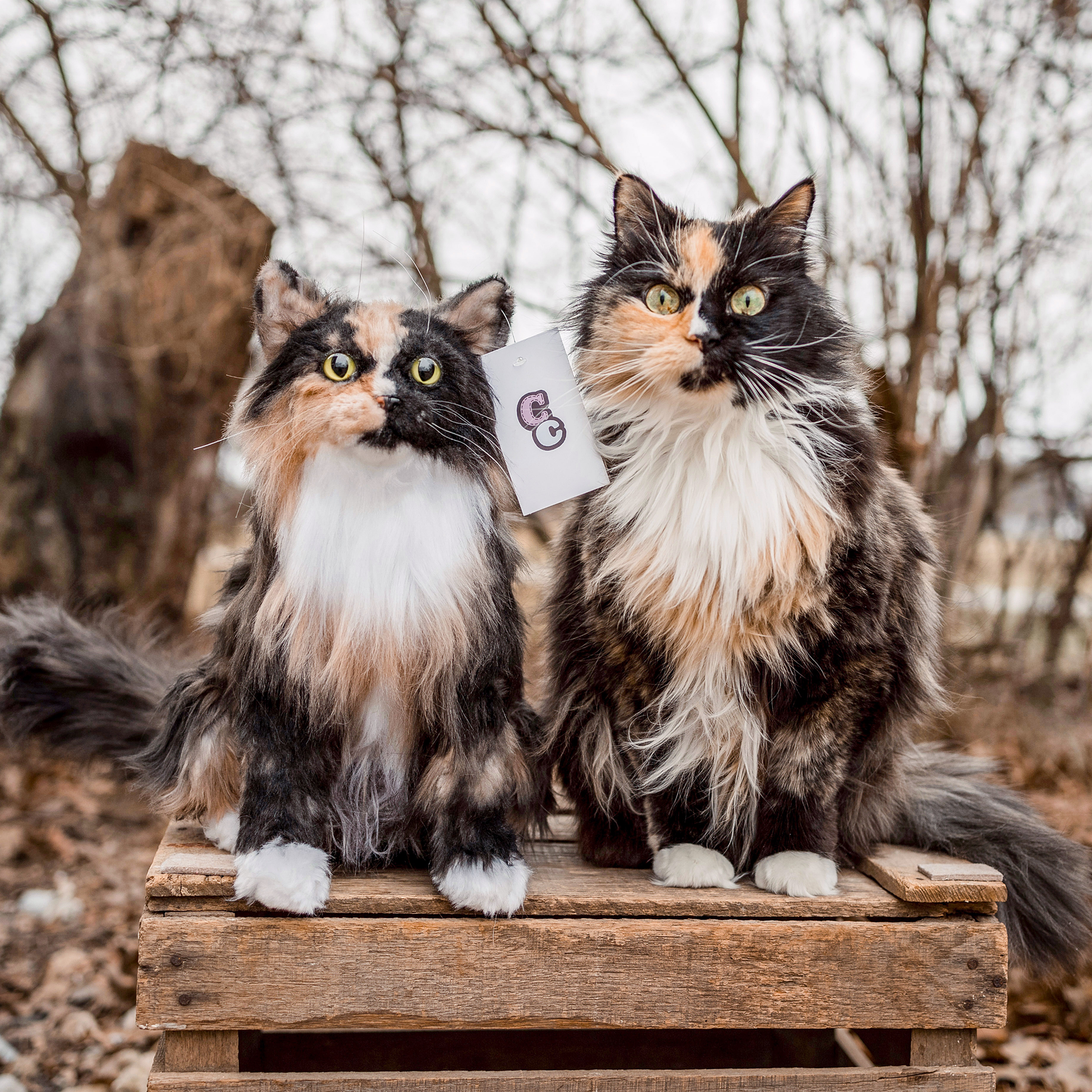 A real cat sitting next to a custom-made plush toy or stuffed animal version of itsef.