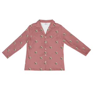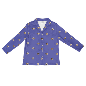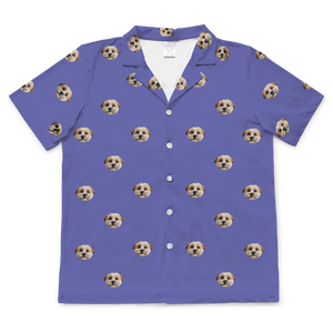 Light blue shirt with dog face and paw prints pattern.