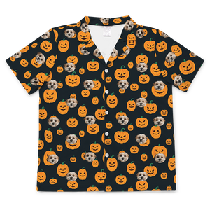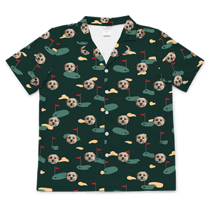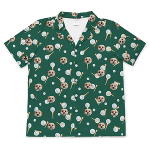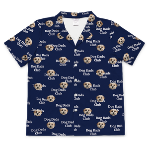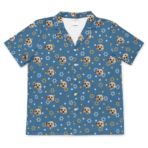Light blue shirt with dog face and paw prints pattern.