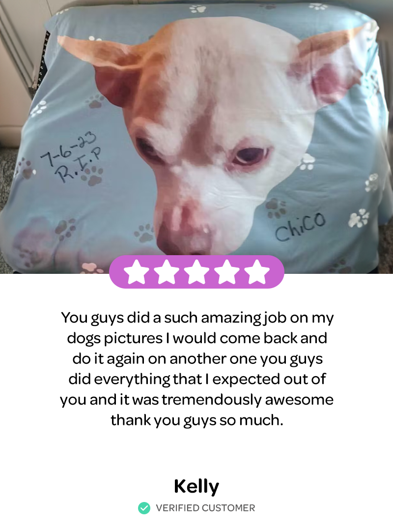 We carefully review each photo as orders come in. If we find any issues with the submitted images, we’ll contact you via email to request additional pictures of your pet. To ensure the highest quality blanket, we recommend submitting photos that are taken in natural daylight (without flash) and at your pet’s eye level.